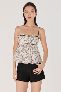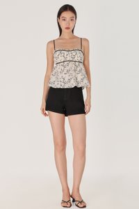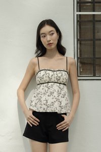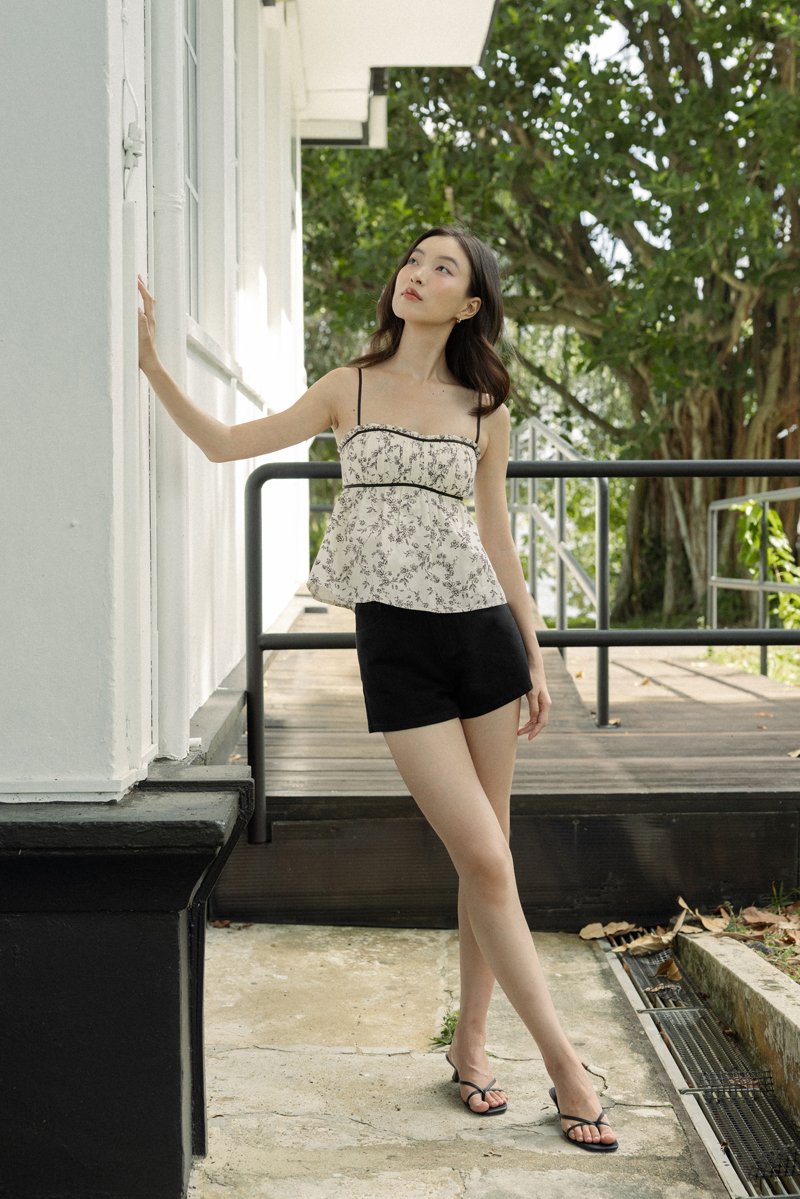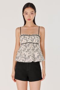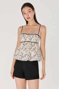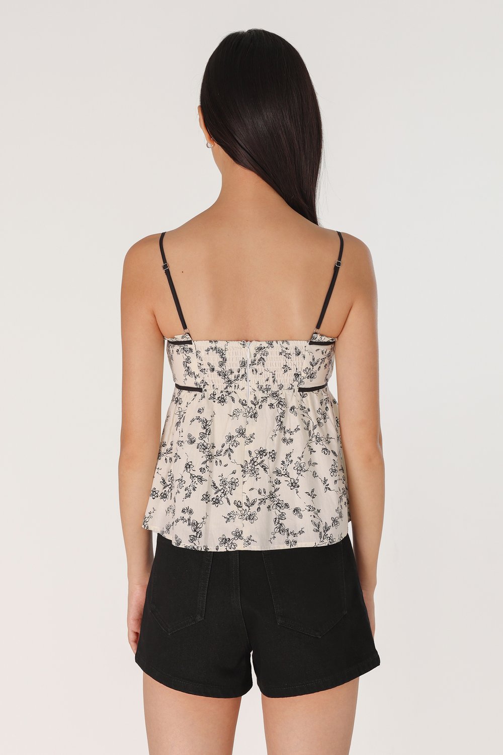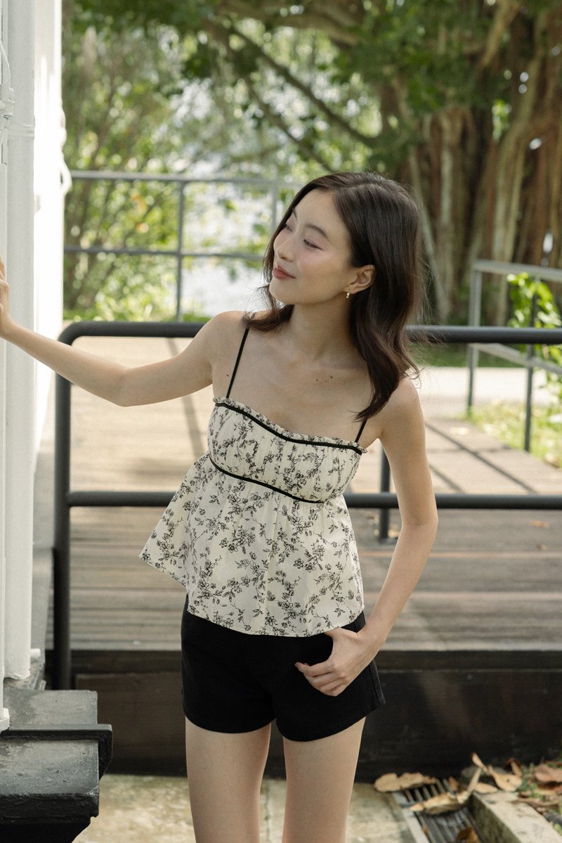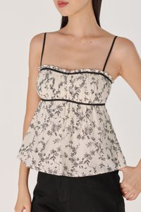 ROSANNE PADDED FLORAL RUCHED CONTRAST TRIM RUFFLE BABYDOLL TOP