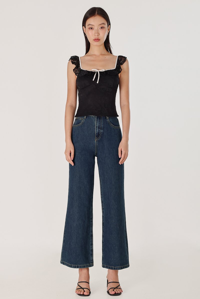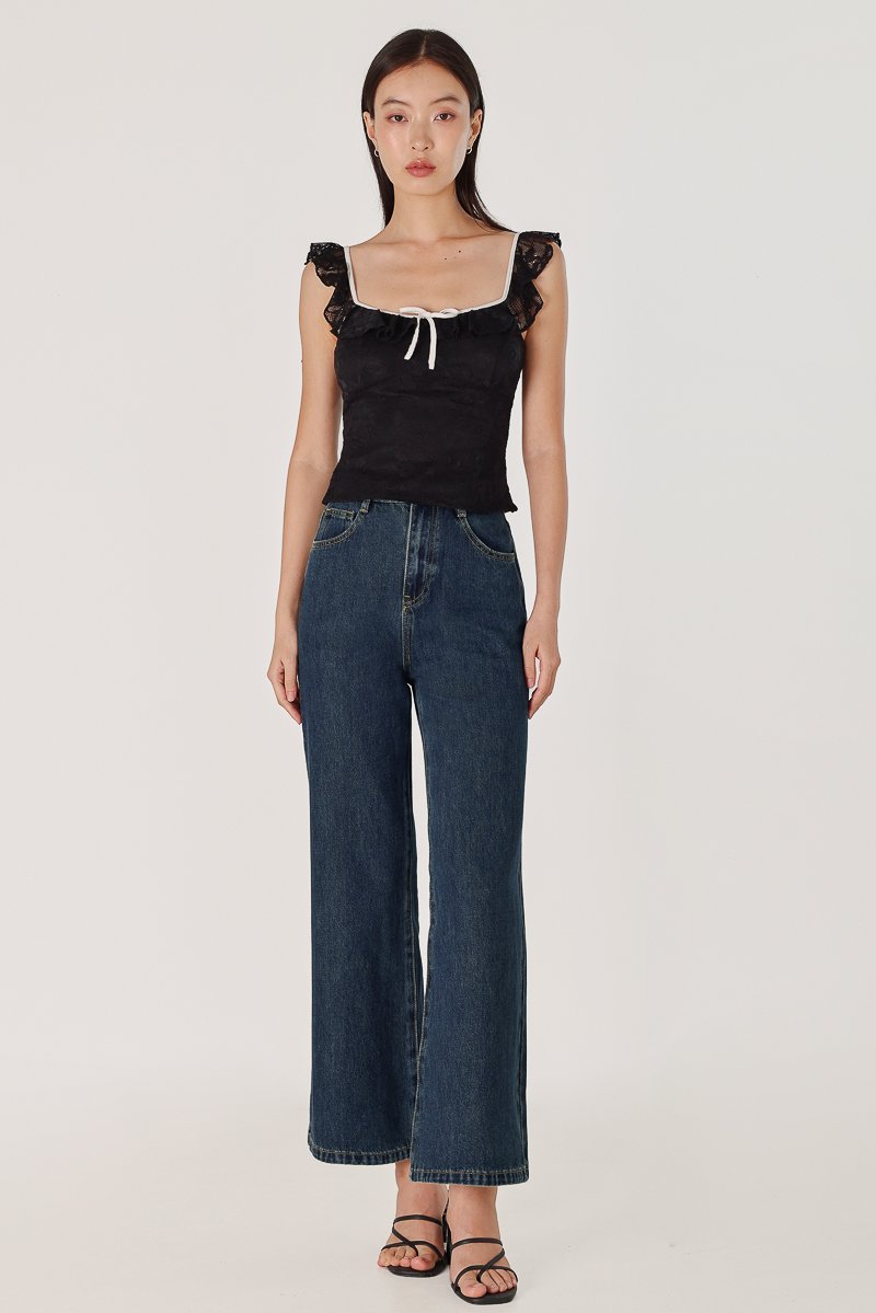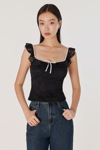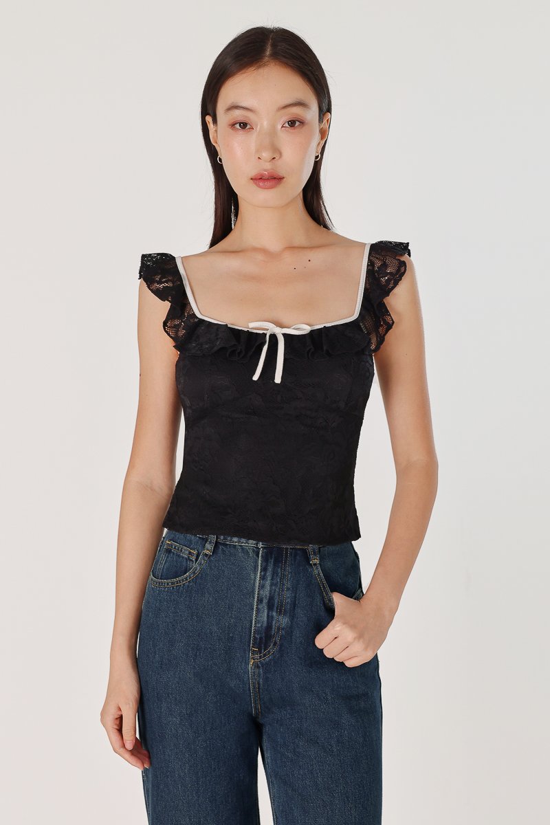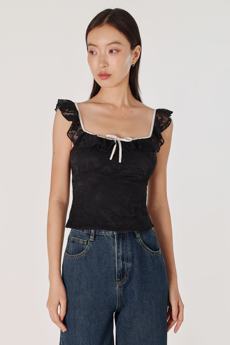 RUTHIE PADDED LACE RUFFLE RIBBON CONTRAST TRIM TOP (BLACK WITH WHITE TRIM)