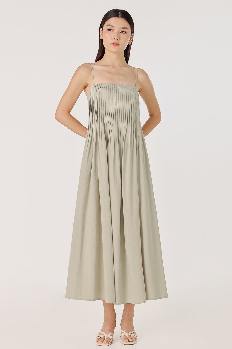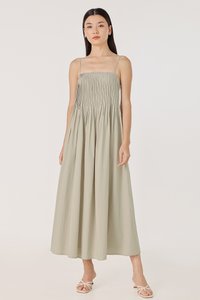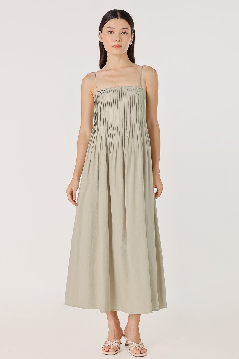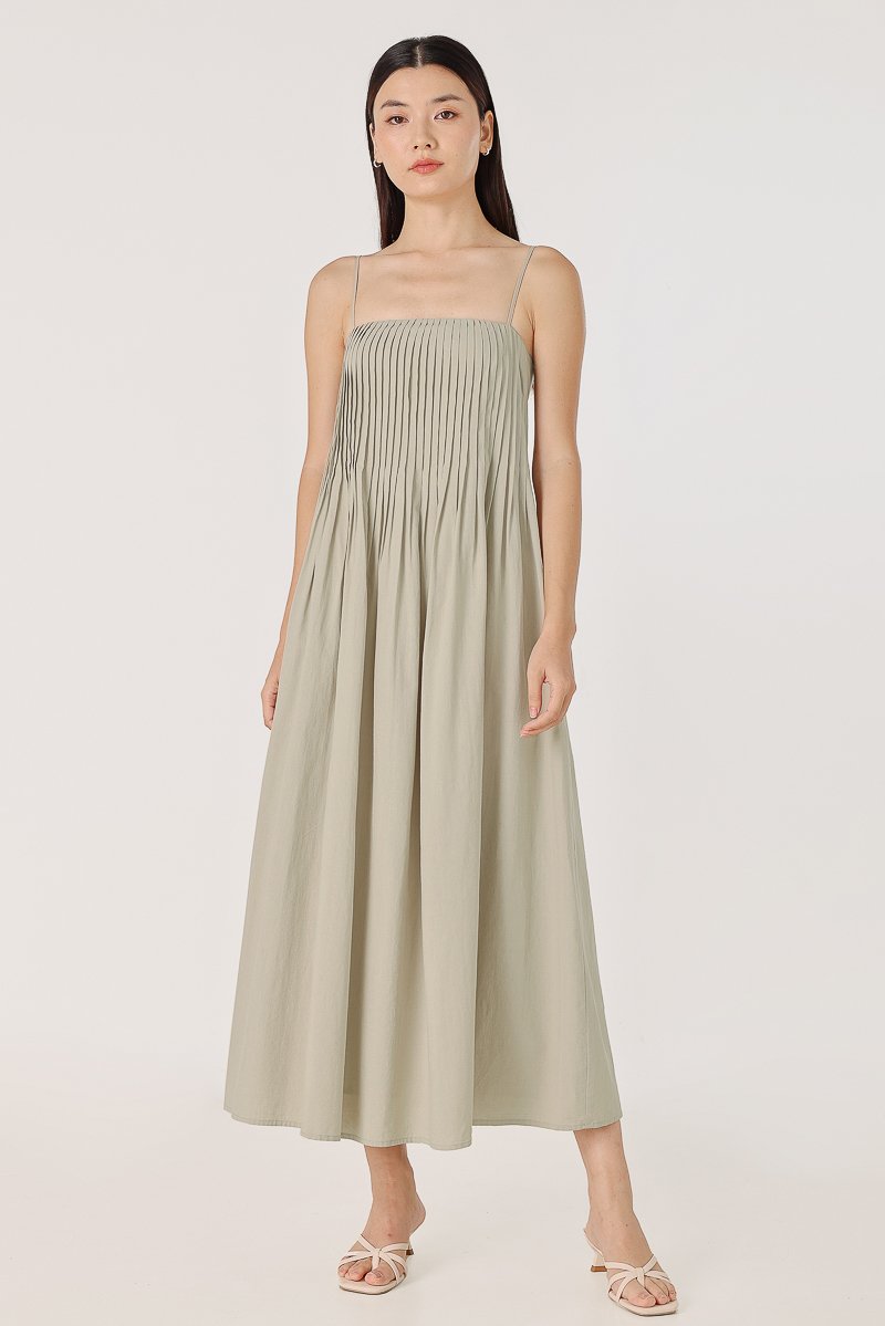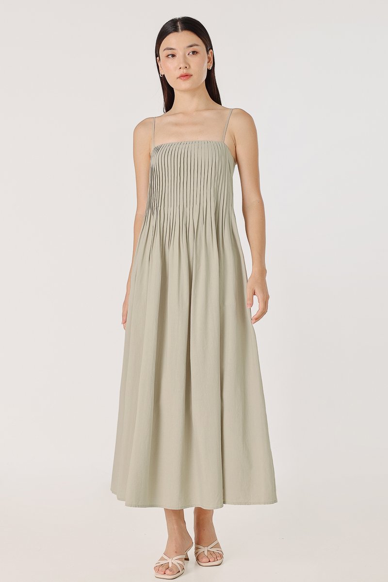 SHAMAINE PADDED LINEN PINTUCK MIDAXI DRESS (GREEN)