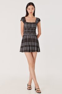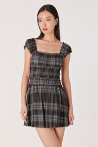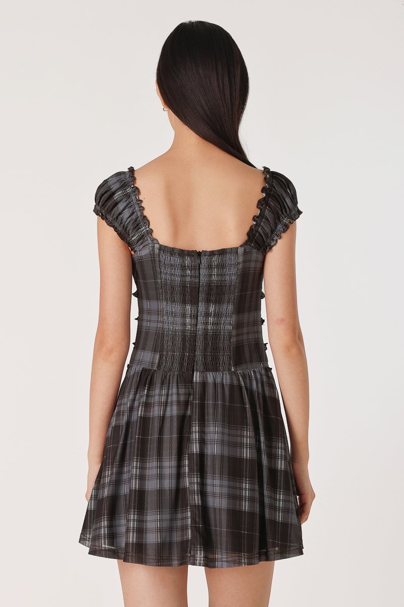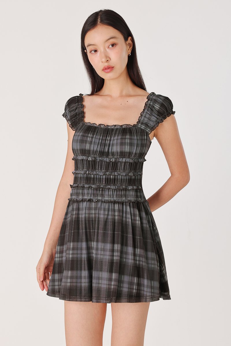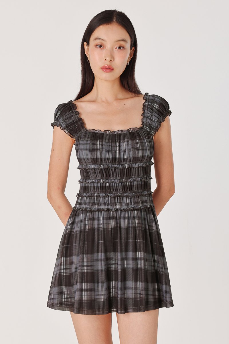 SHERINA PADDED MESH PLAID RUCHED SKORTS DRESS