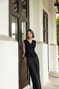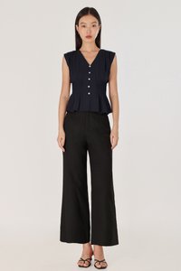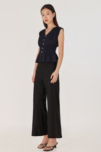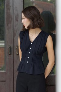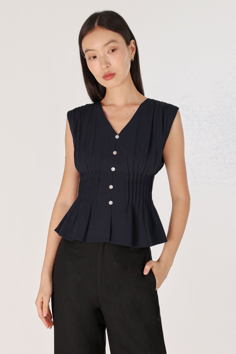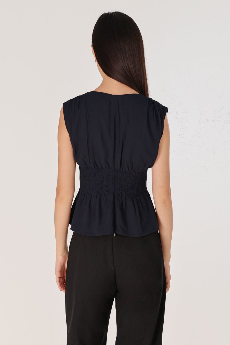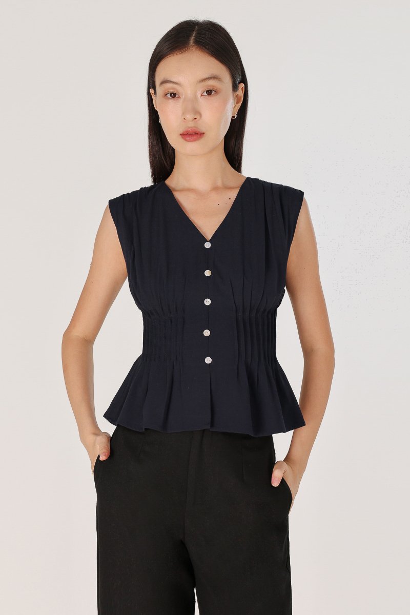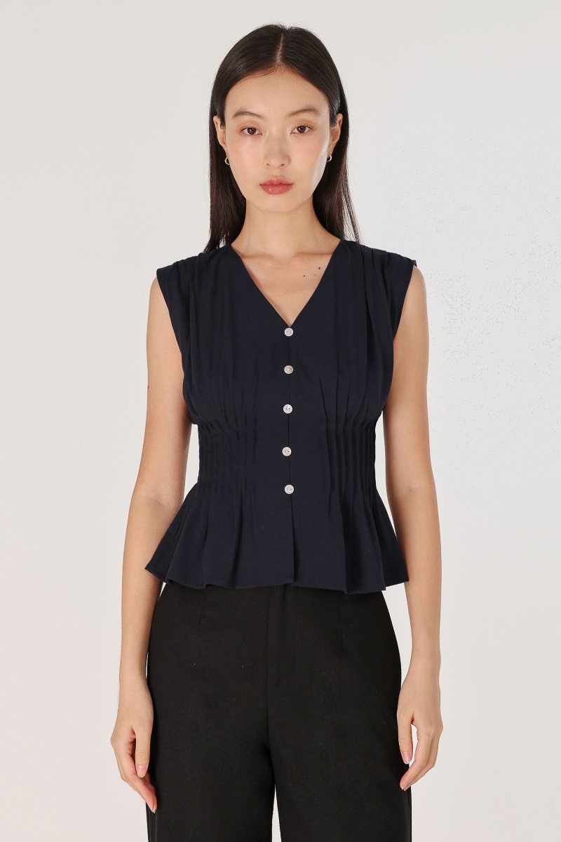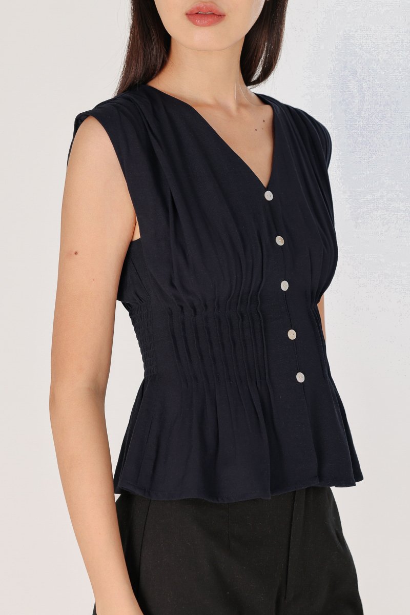 ZALIYAH PINTUCK SHELL BUTTON V-NECK TOP (MIDNIGHT BLUE)