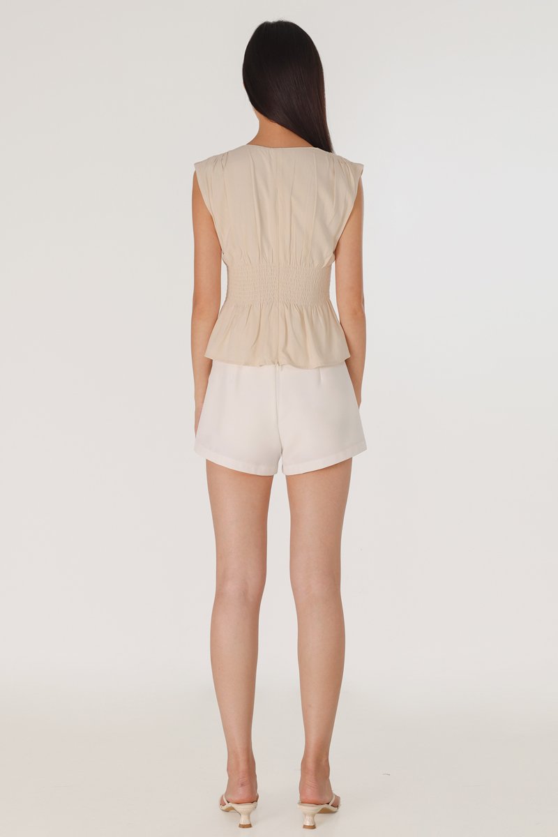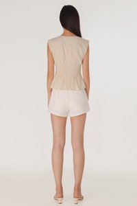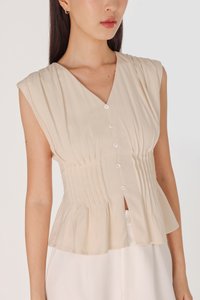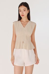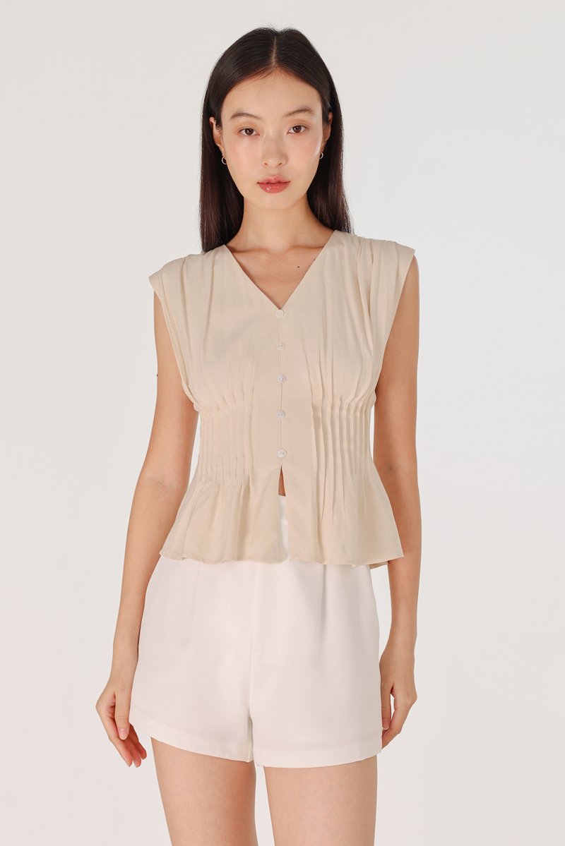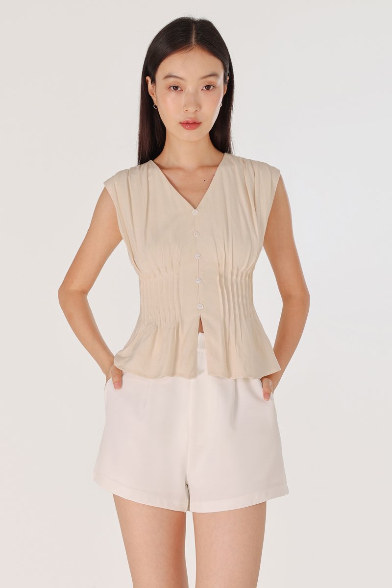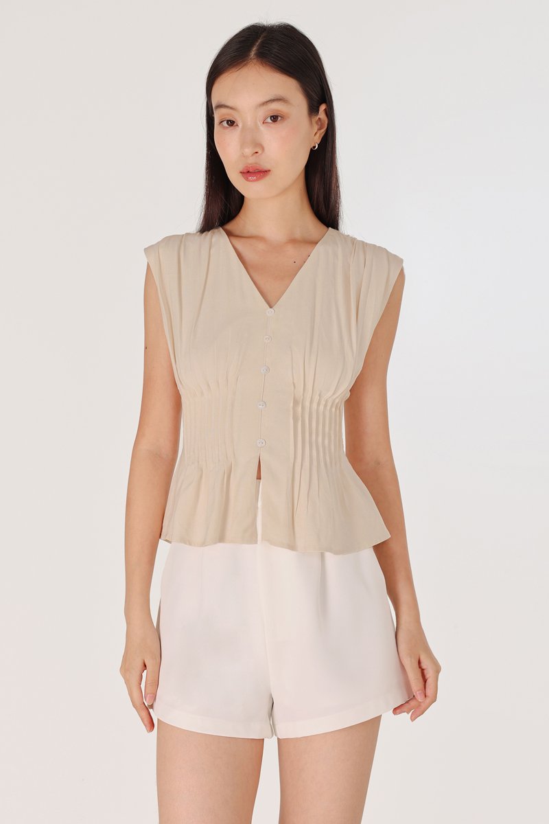 ZALIYAH PINTUCK SHELL BUTTON V-NECK TOP (OAT)
